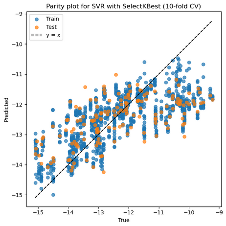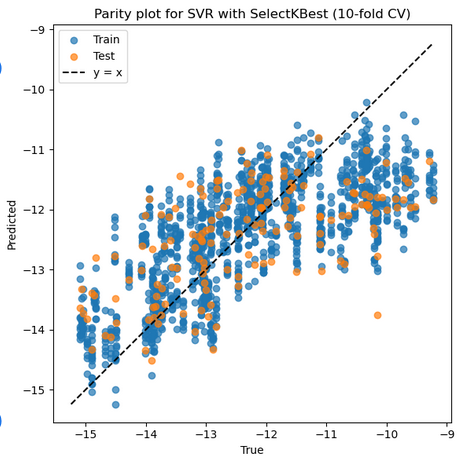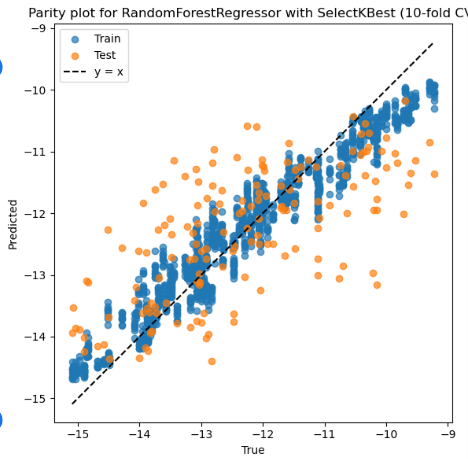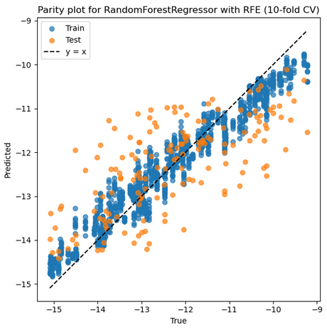 To accurately measure their generalization performance, we performed training and testing of the RFR models using their own code for all the folds with slight modifications to keep track of the average scores and produced a comprehensive parity plot.
