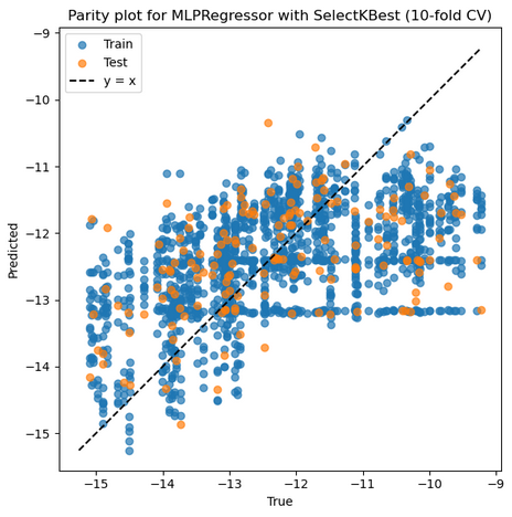 Our MLP from sklearn performed the worst, this might be attributed to neural networks typically requiring larger datasets to realize their capacity for modelling complex non‑linear mappings. Early stopping and dropout helped avoid over‑fitting, but the net likely under‑fit due to limited epochs and conservative regularization is reflected in low train r (≈ 0.55). The reference paper’s DNN achieved superior results by training on an expanded set of 12,561 pairwise interaction features, which both increased effective sample size and exposed richer structure to the network.