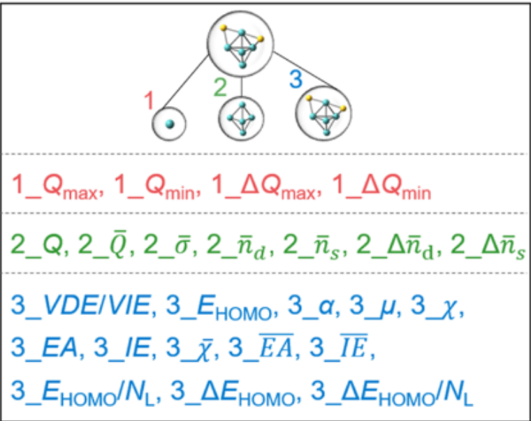 - All 24 candidate features derived from the three-level feature extraction, illustrated using the structure of Mo₅S₂⁻. Figure adapted from original paper.