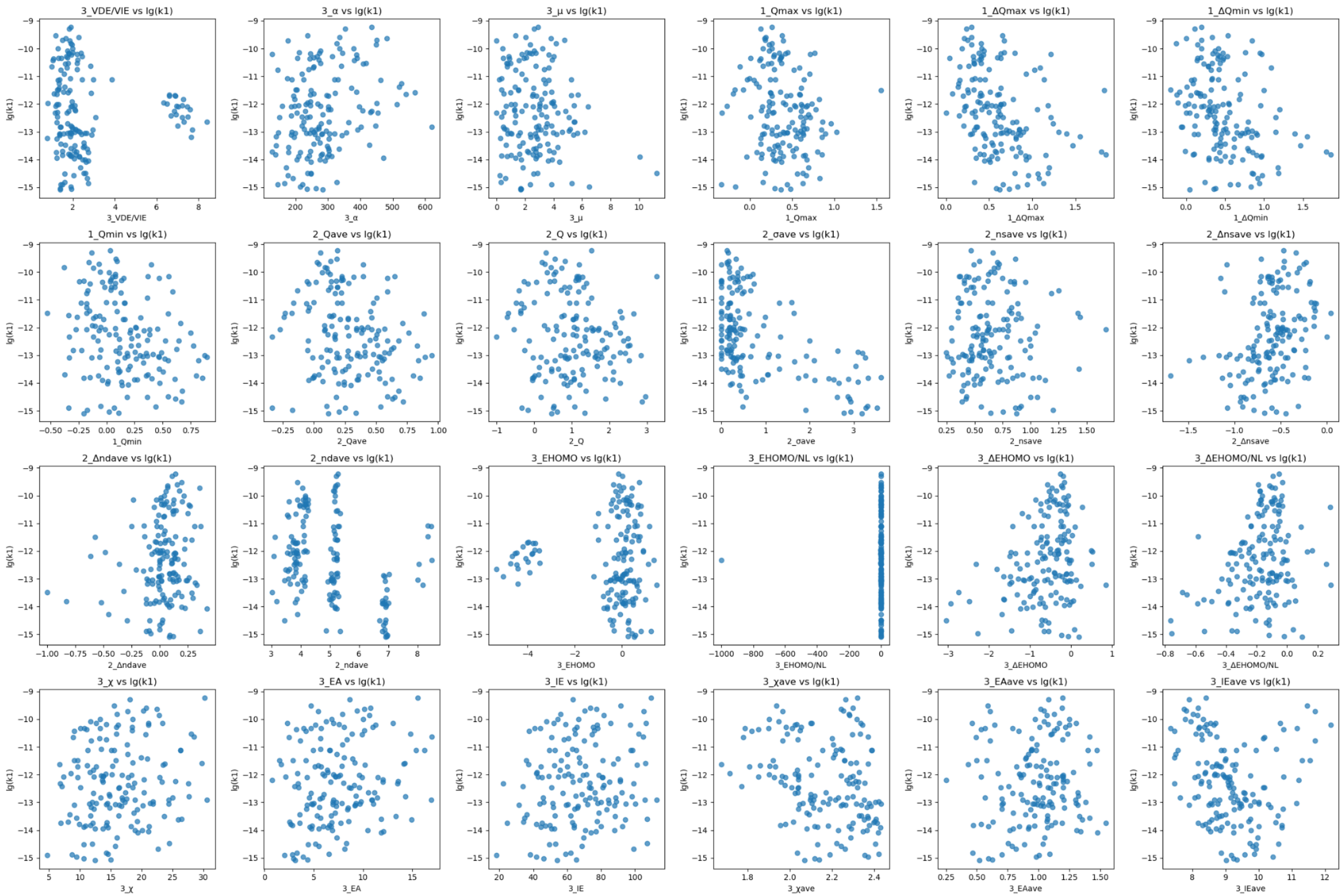 The authors found that none of the individual descriptors map to lg(k₁) linearly. Some features like average spin density show threshold‑type behavior rather than a constant slope. Others like ΔE_HOMO/N_L interact multiplicatively with site‑level charges, producing curved or segmented trends. To verify we plotted each feature against the label (code can be found in feature-label-relationship.py):