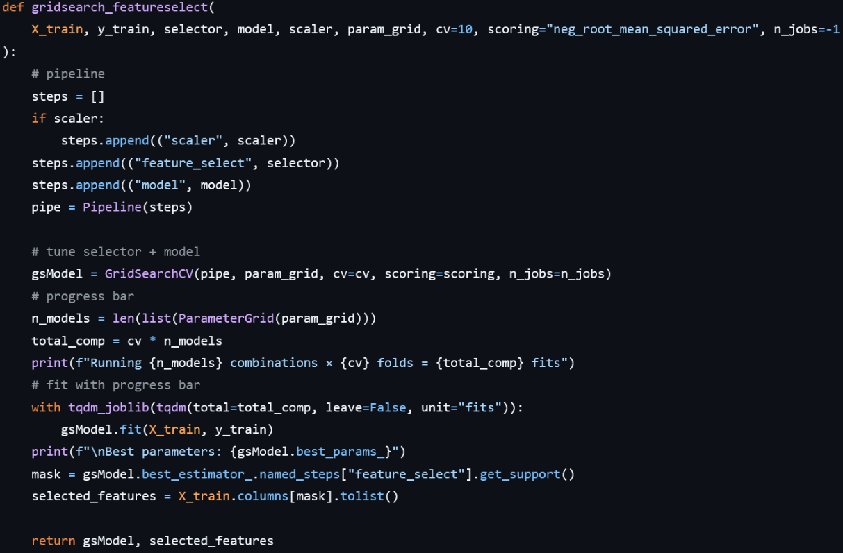 This pipeline is passed to GridSearchCV, which iterates over all combinations of hyperparameters defined in param_grid, performing cross-validation for each. A tqdm‐wrapped context shows real‐time progress of total fits (n_models × cv). Once fitting completes, the function prints the best parameters, pulls the support mask from the selector step of the best estimator to identify the chosen features, and returns both the GridSearchCV object and the selected feature names.